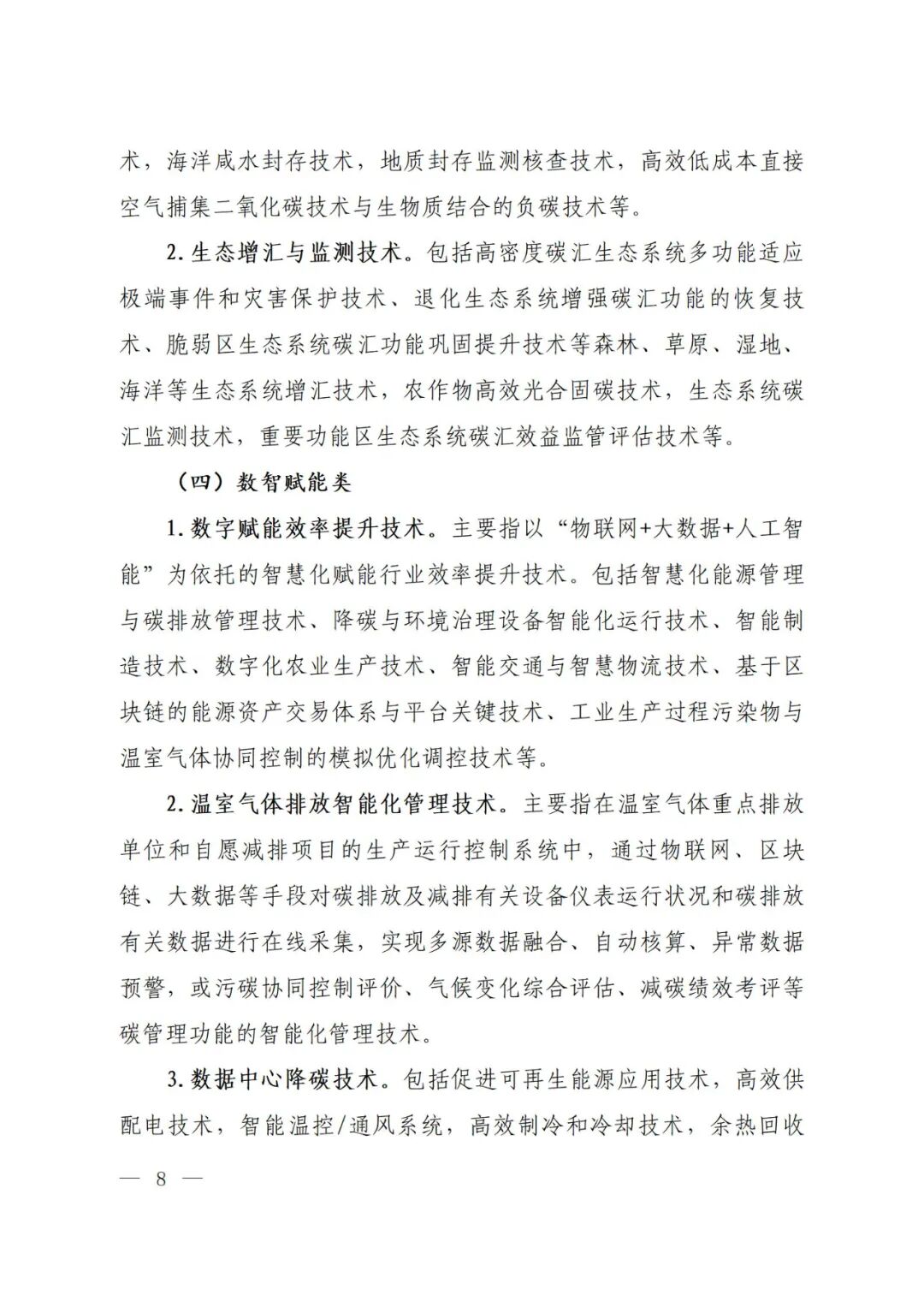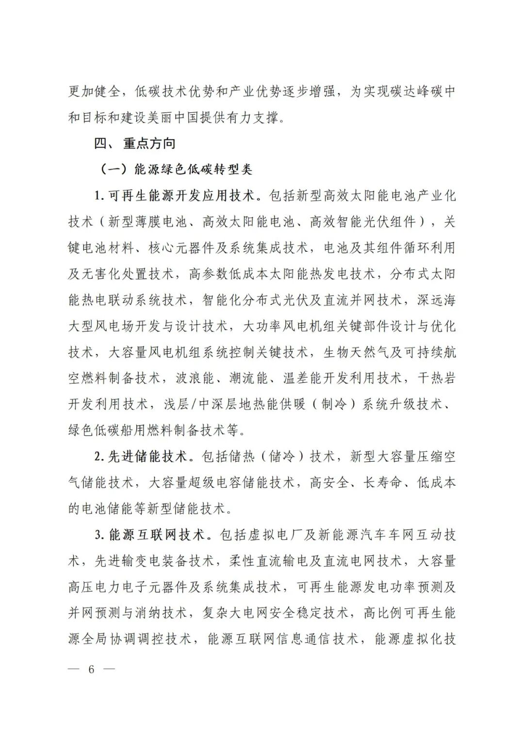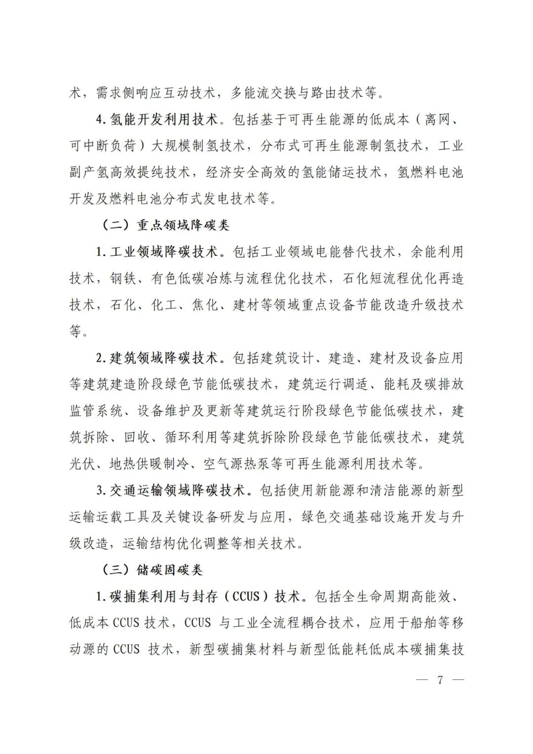 为引导各行业领域积极探索绿色低碳转型路径和解决方案,《实施方案》强调以技术降碳潜力和降碳效果为目标导向,按照技术的先进性和成熟度,遴选和推广具有降碳潜力、代表科技创新方向的示范类技术和降碳效果显著、适合规模化应用的推广类技术,主要包括五大重点方向,覆盖能源、工业、农业、建筑、交通等温室气体减排关键领域。第一是能源绿色低碳转型类,主要包括可再生能源开发与应用技术,先进储能技术,能源互联网技术,氢能开发利用技术等。第二是重点领域降碳类,主要包括工业领域降碳技术,建筑领域降碳技术,交通运输领域降碳技术等。第三是储碳固碳类,主要包括CCUS技术和生态增汇与监测技术等。第四是数智赋能类,主要包括数字赋能效率提升技术,温室气体排放智慧化管理技术,数据中心降碳技术等。第五是非二氧化碳减排类,主要包括甲烷减排类技术、氢氟碳化物减排类技术、氧化亚氮减排类技术及其他非二氧化碳温室气体减排技术等。