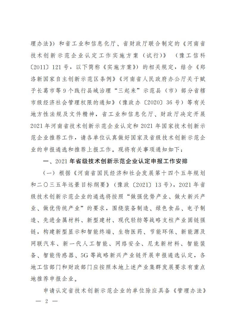 河南省工业和信息化厅 河南省财政厅关于组织推荐申报2021年技术创新示范企业的通知