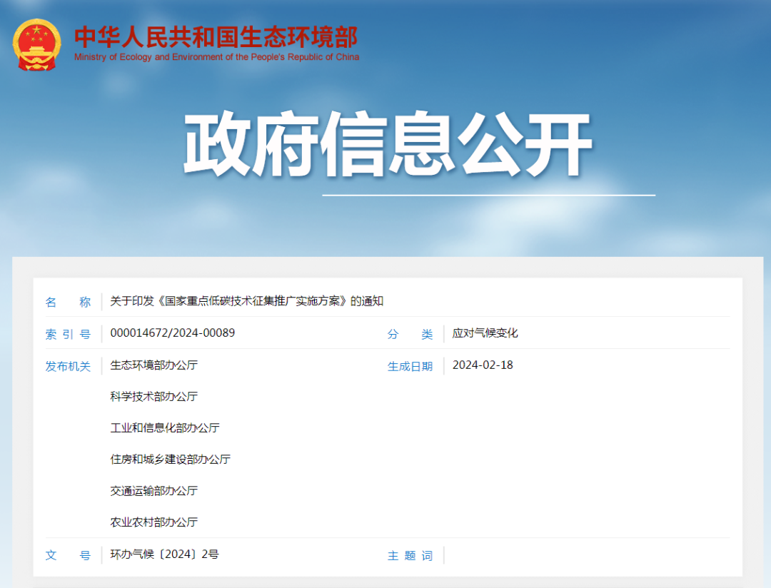 近日,生态环境部等六部门联合印发《国家重点低碳技术征集推广实施方案》(以下简称《实施方案》)。