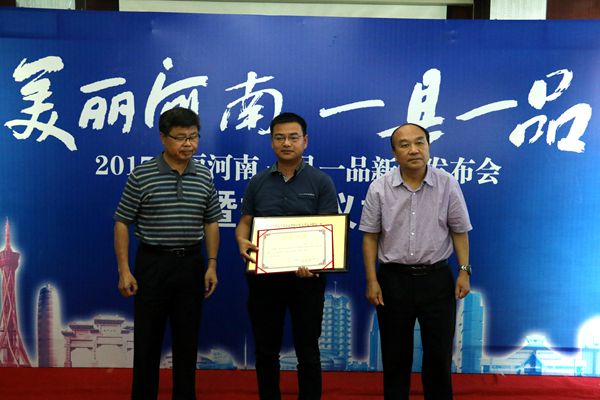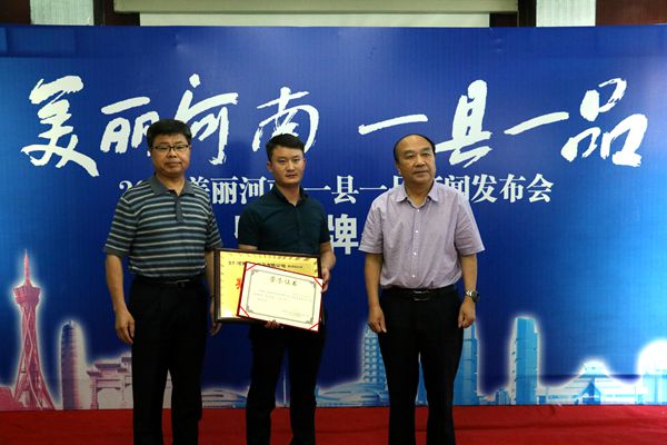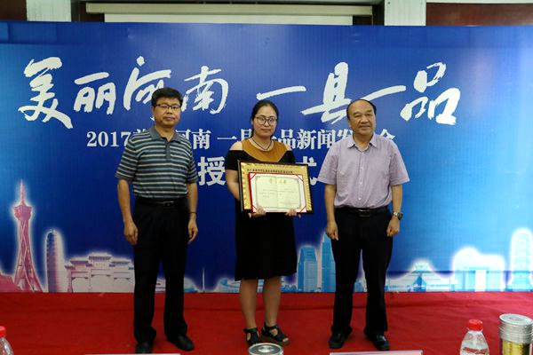 2017“美丽河南·一县一品”入围企业进行现场发布, 河南省一县一品创建活动办公室主任赵志正、河南出入境检验检疫局处长胡守明为入围“美丽河南·一县一品”企业授牌。